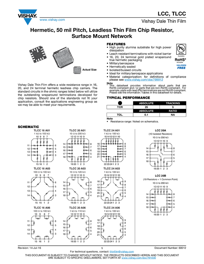 Hermetic, 50 Mil Pitch, Leadless Chip Thin Film Resistor Networks