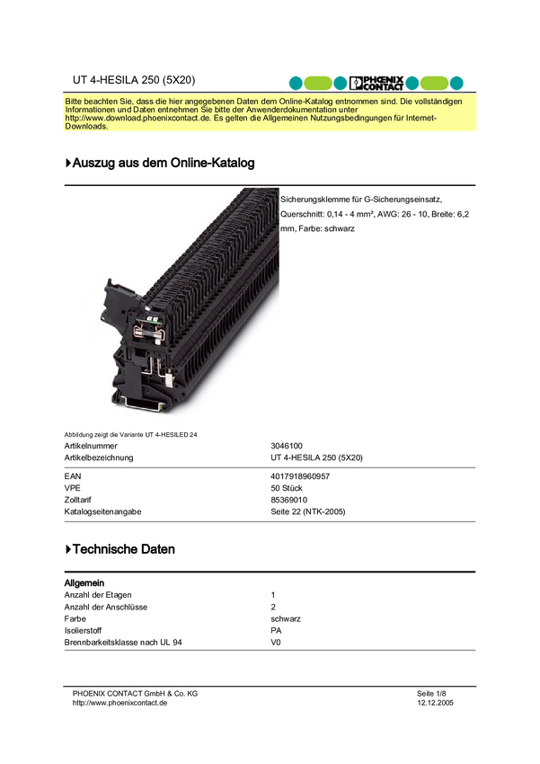 Złączka szynowa Phoenix Contact UT 4-HESILA 250 (5X20)