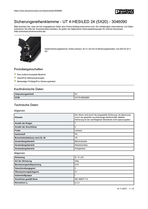 Złączka szynowa Phoenix Contact UT 4-HESILED 24 (5X20)