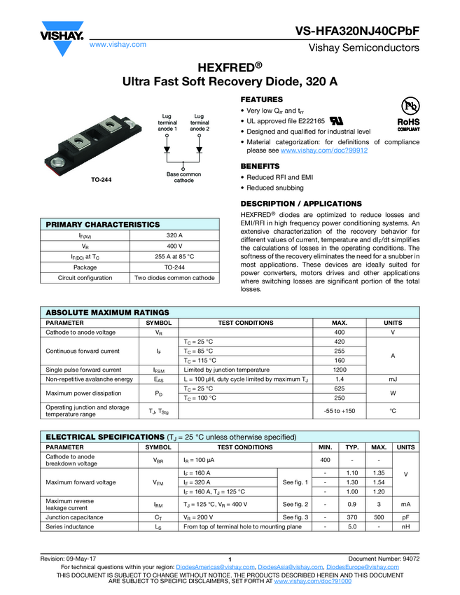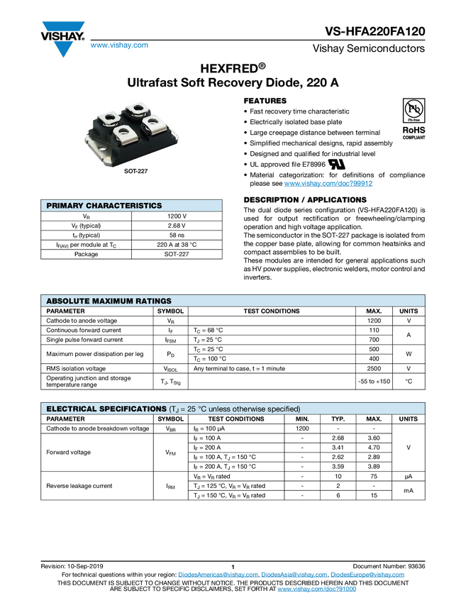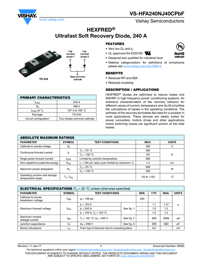HEXFRED® Ultrafast Soft Recovery Diode, 240 A