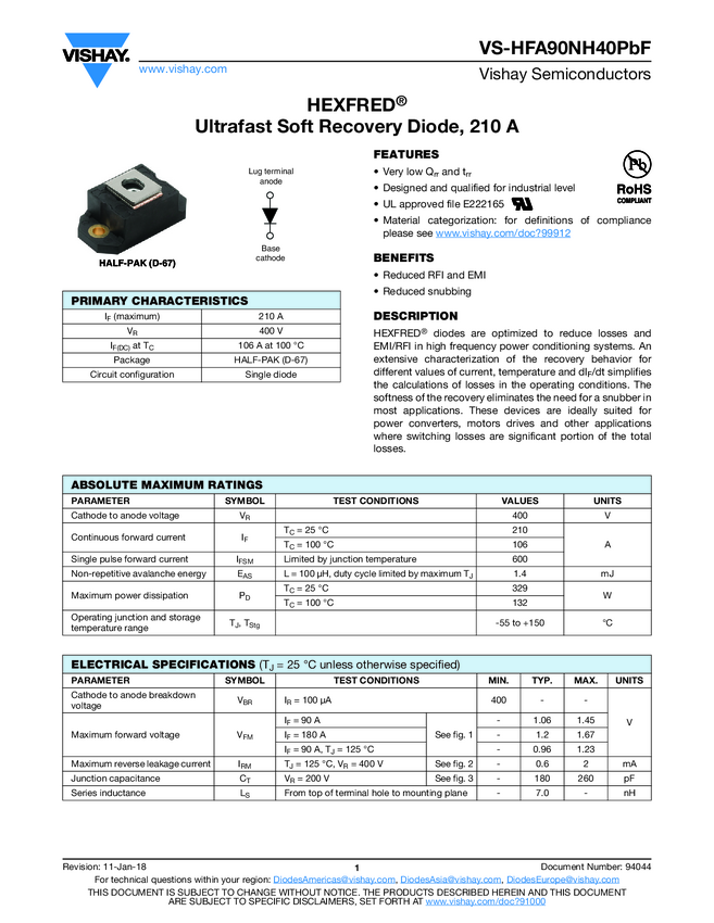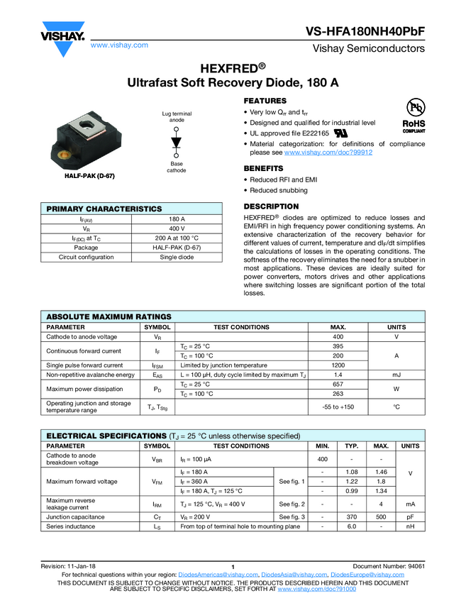 HEXFRED® Ultrafast Soft Recovery Diode, 180 A