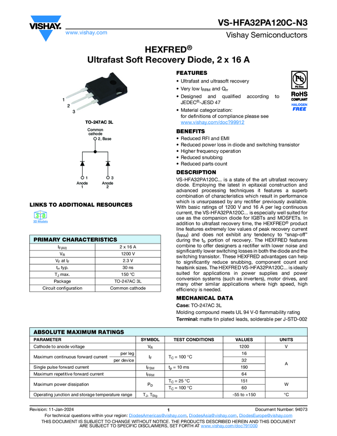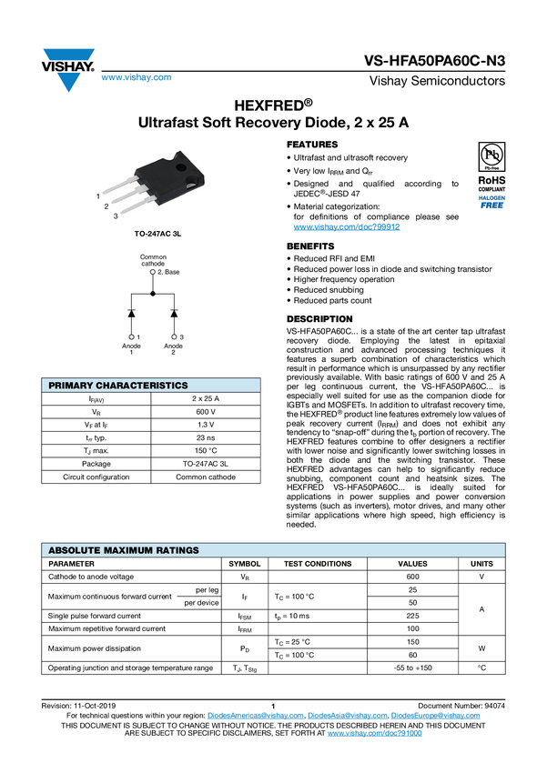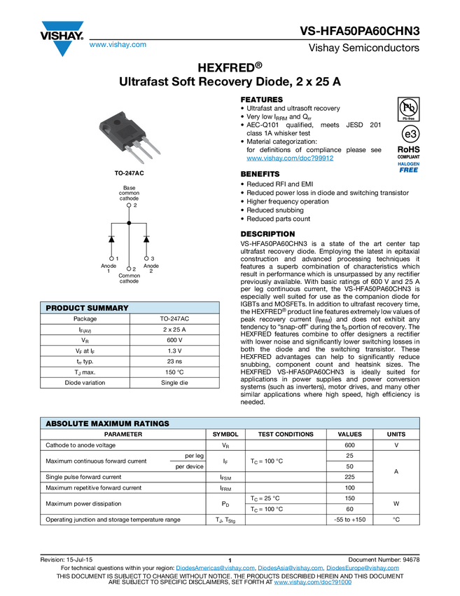HEXFRED® Ultrafast Soft Recovery Diode, 25 A