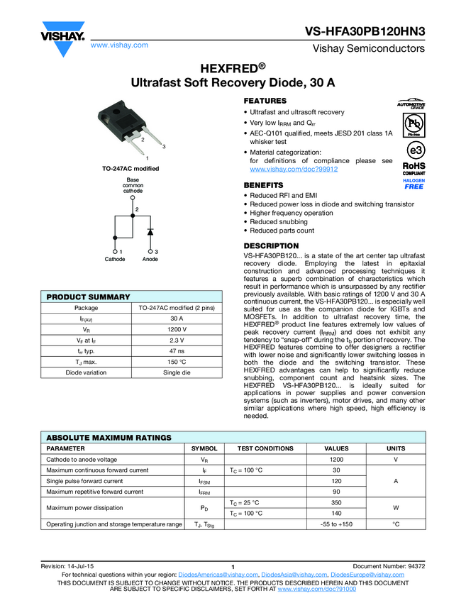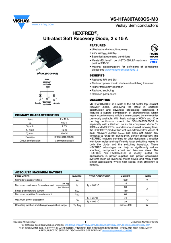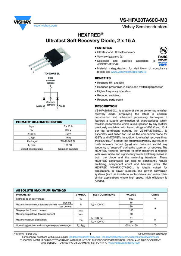 HEXFRED® Ultrafast Soft Recovery Diode, 30 A