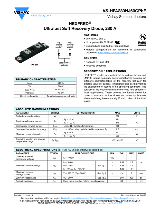 HEXFRED® Ultrafast Soft Recovery Diode, 280 A
