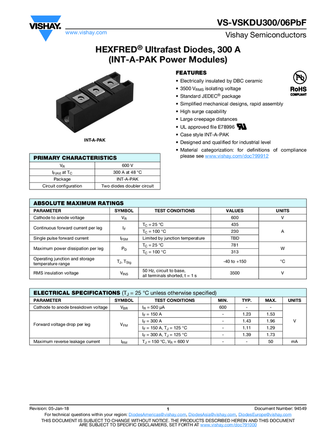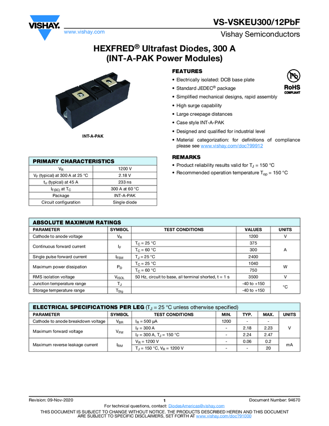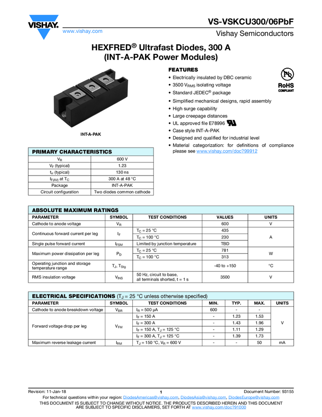 HEXFRED® Ultrafast Diodes, 300 A (INT-A-PAK Power Modules)