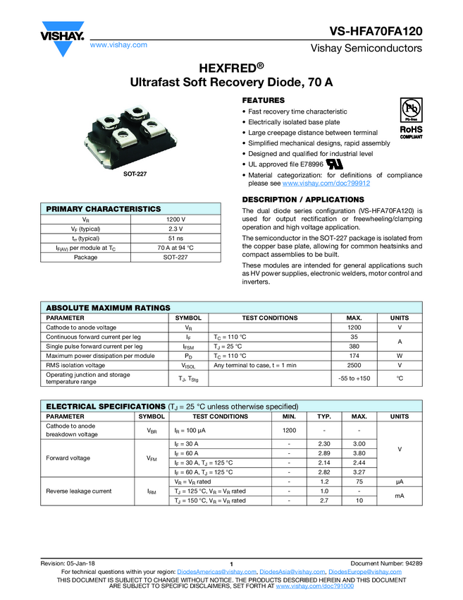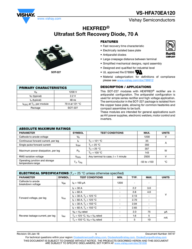HEXFRED® Ultrafast Soft Recovery Diode, 70 A