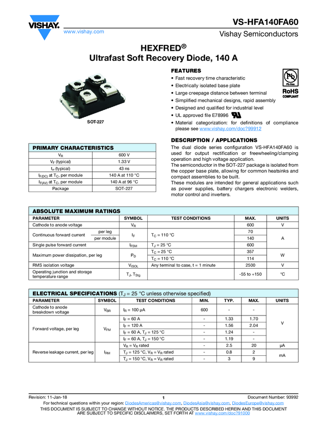 HEXFRED® Ultrafast Soft Recovery Diode, 140 A