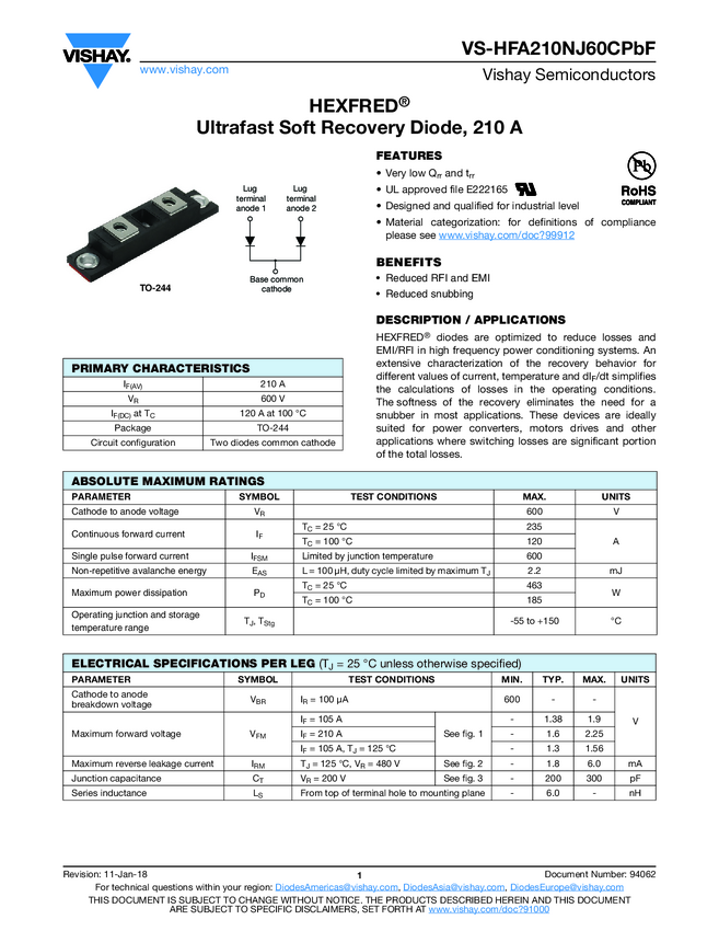 HEXFRED® Ultrafast Soft Recovery Diode, 210 A