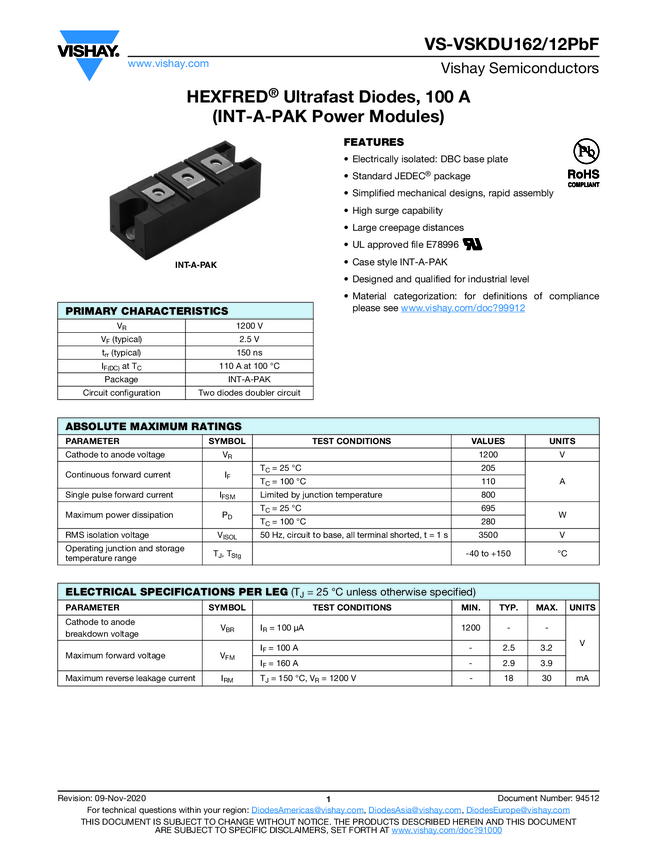HEXFRED® Ultrafast Diodes, 100 A (INT-A-PAK Power Modules)