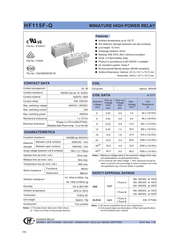 Przekaźnik rozruchowy HF115F-S/012-HSF Monostabilny, 4000 VA Max