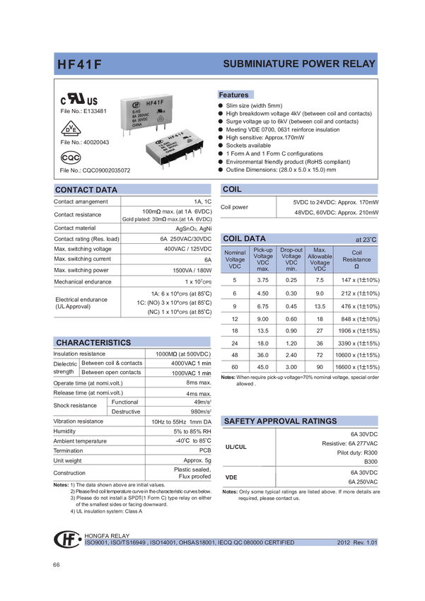Przekaźnik; elektromagnetyczny; HF41F-024-ZS; 24V; 6A/250V; SPDT 1 styk przełączny; na PCB; THT; Hongfa; = RM699BV-3011-85-1024; 2961121; RoHS