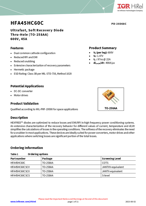 The HFA45HC60CSCV is a 600V 45A HiRel ultrafast common cathode diode in a TO-258AA package. It's optimized for high frequency power conditioning systems, reducing losses and EMI/RFI, while eliminating the need for a snubber due to its soft recovery. Ideal for power converters, motor drives, and other applications where switching losses are significant. This device has S level screening and is suitable for space applications.
