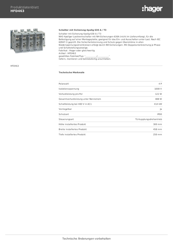 Hager HFD463 Przełącznik 4 styki 630 A 1 szt.