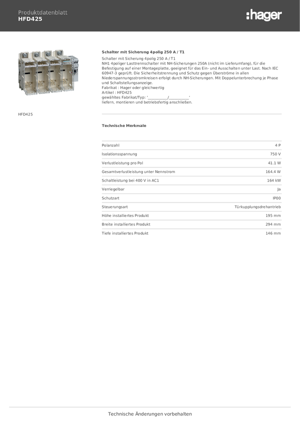 Hager HFD425 Przełącznik 4 styki 250 A 1 szt.