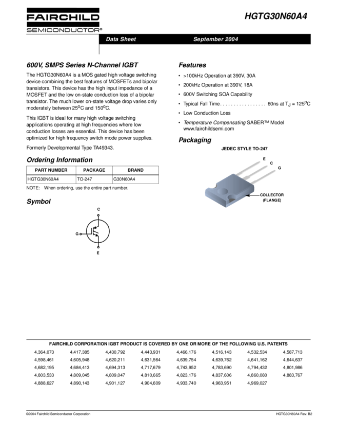 Tranzystor; HGTG30N60B3D; IGBT; 60A; 600V; 208W; +dioda; TO247; THT; Fairchild Semiconductor; HGTG30N60B3D; RoHS