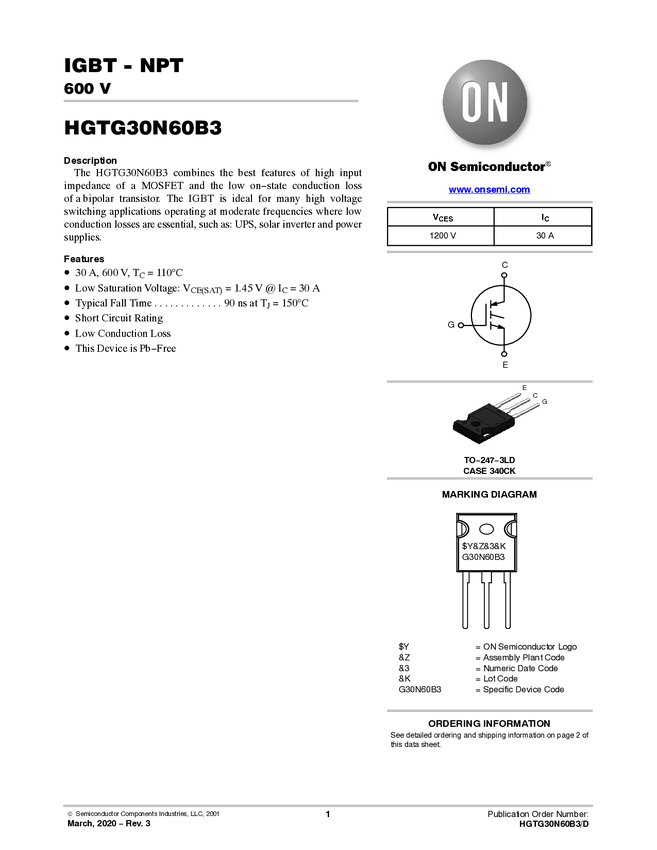 Tranzystor; HGTG30N60B3D; IGBT; 60A; 600V; 208W; +dioda; TO247; THT; Fairchild Semiconductor; HGTG30N60B3D; RoHS