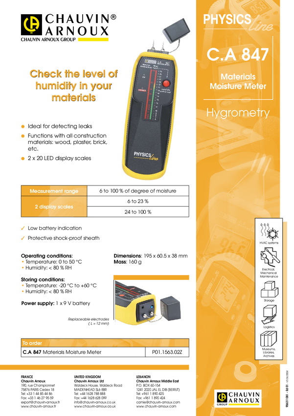 Higrometr do materiałów budowlanych Chauvin Arnoux C.A 847 inwazyjny