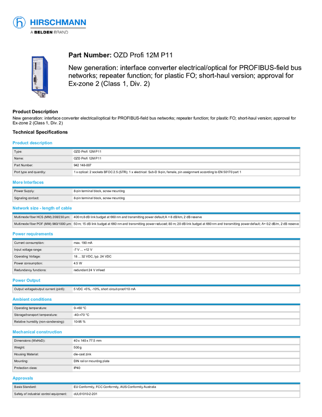 Konwerter interfejsu Hirschmann 942 148-007 Profibus 24 V/DC
