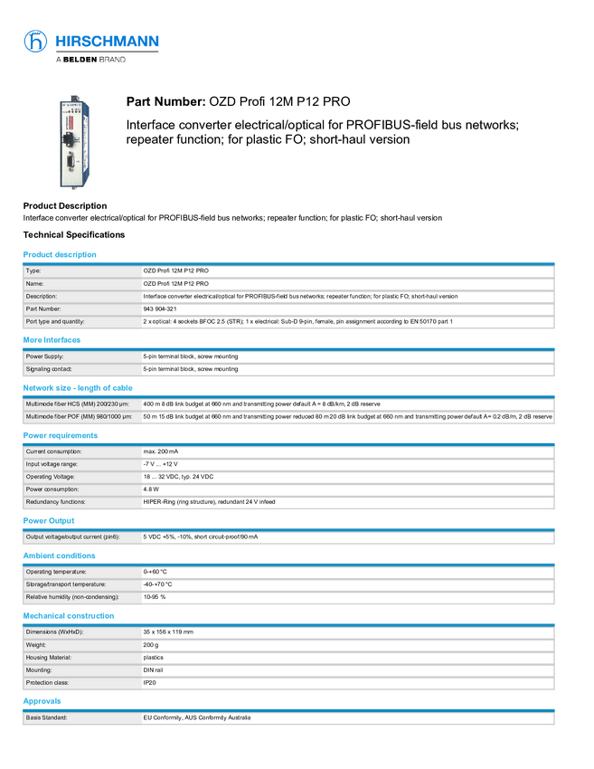 Konwerter interfejsu Hirschmann 943 904-321 Profibus 24 V/DC