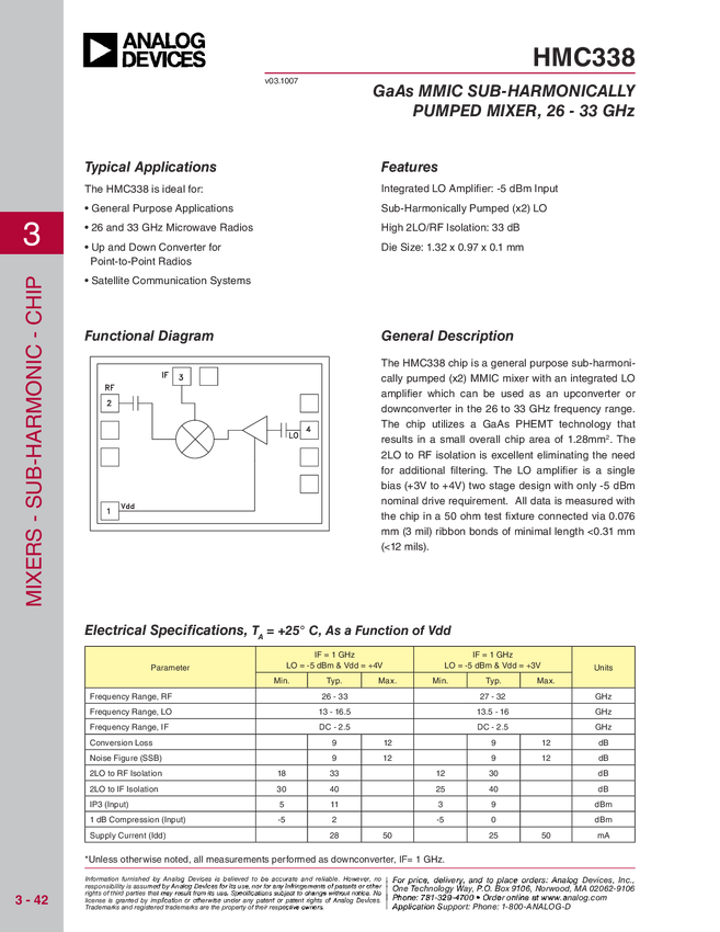 GaAs MMIC Sub Harmonic Mixer Chip, 26 - 33 GHz