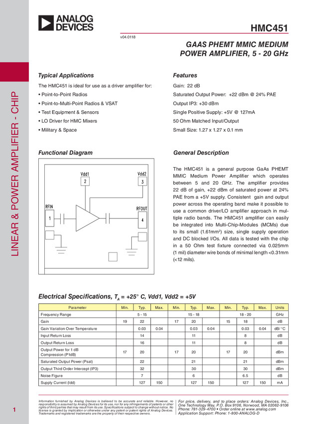 GaAs pHEMT MMIC Medium Power Amplifier, 5 - 20 GHz