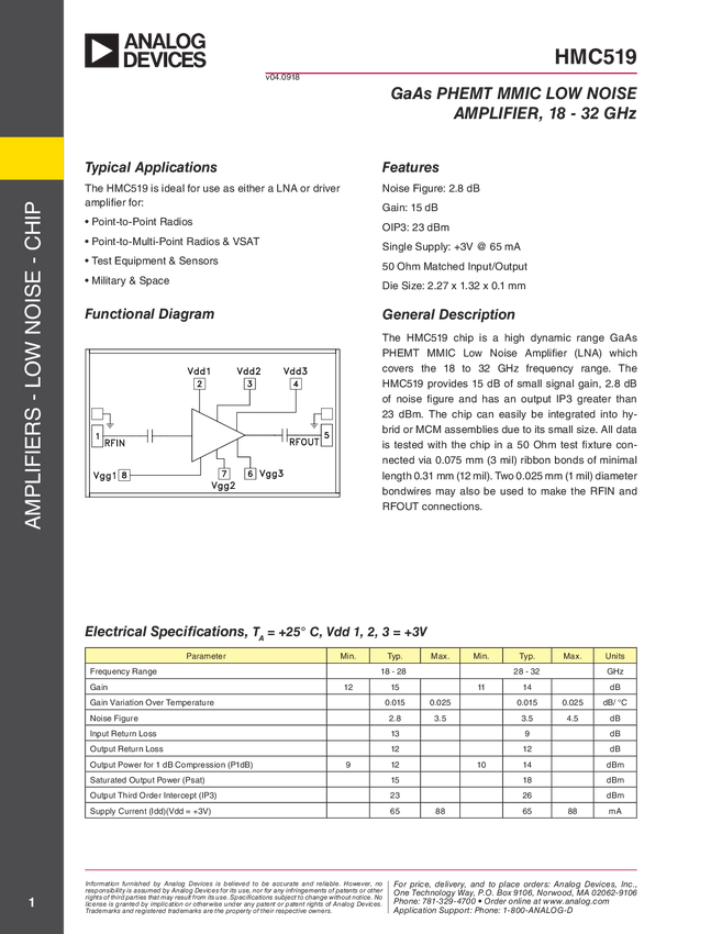 GaAs pHEMT MMIC Low Noise Amplifier, 18 - 31 GHz