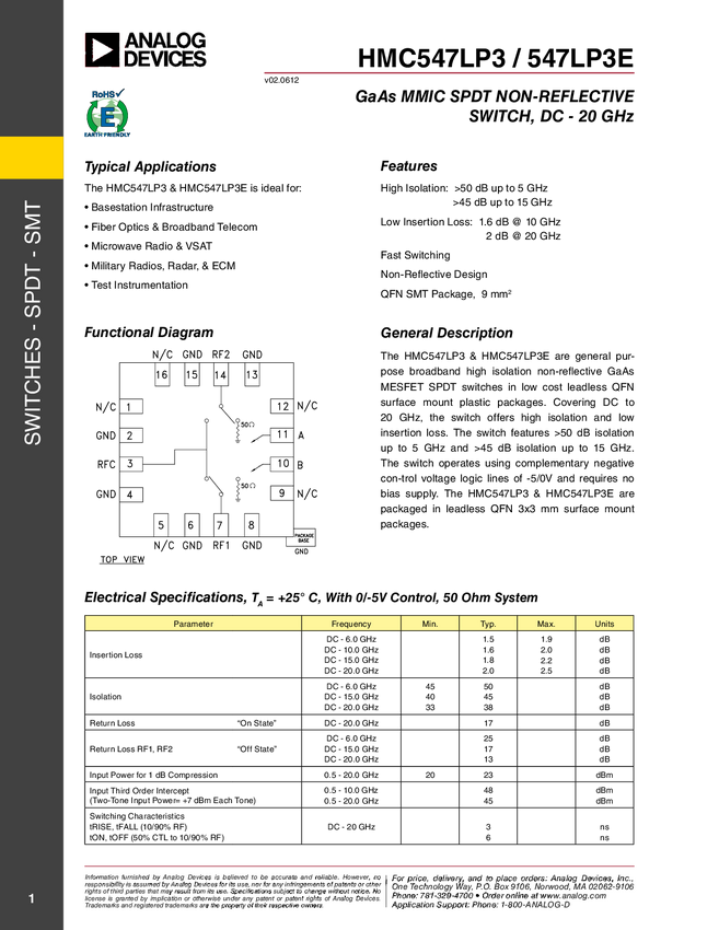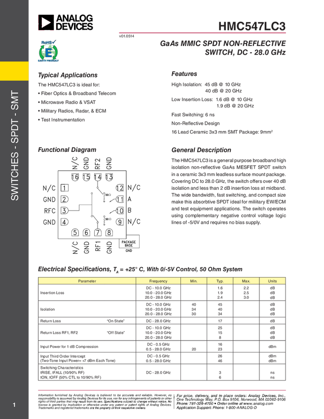 GaAs MMIC, High Isolation SPDT Nonreflective Switch SMT, DC to 28.0 GHz