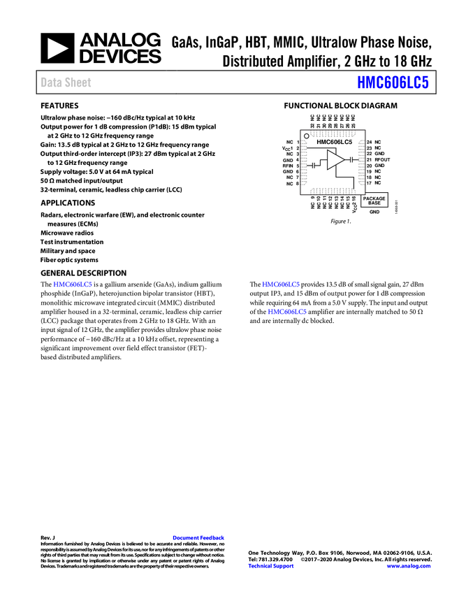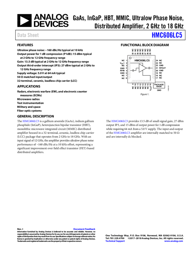 GaAs, InGaP, HBT, MMIC, Ultralow Phase Noise, Distributed Amplifier, 2 GHz to 18 GHz