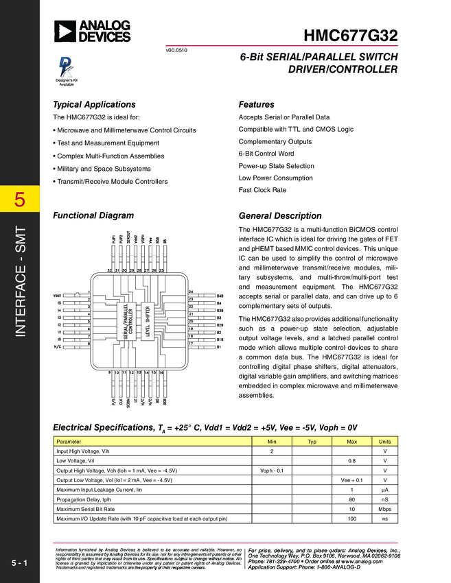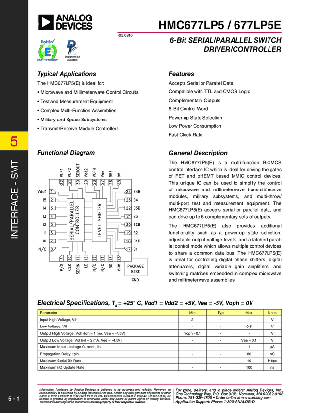 6-Bit serial/parallel switch driver/controller, available with surface mount technology (SMT)