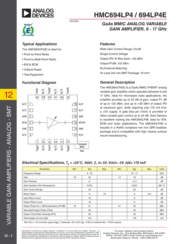 Analog Variable Gain Amplifier SMT, 6 -17 GHz