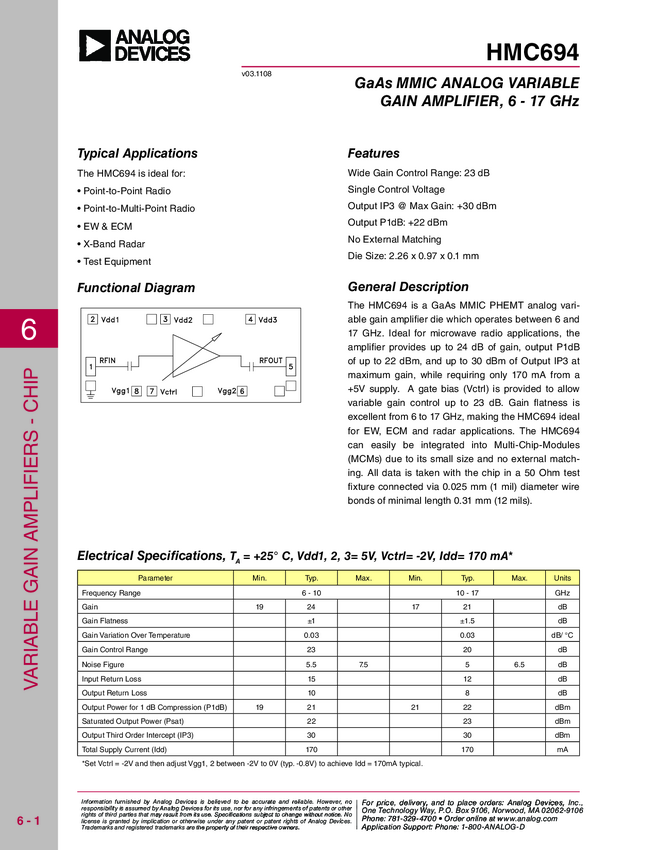 GaAs MMIC Analog Variable Gain Amplifier, 6 - 17 GHz