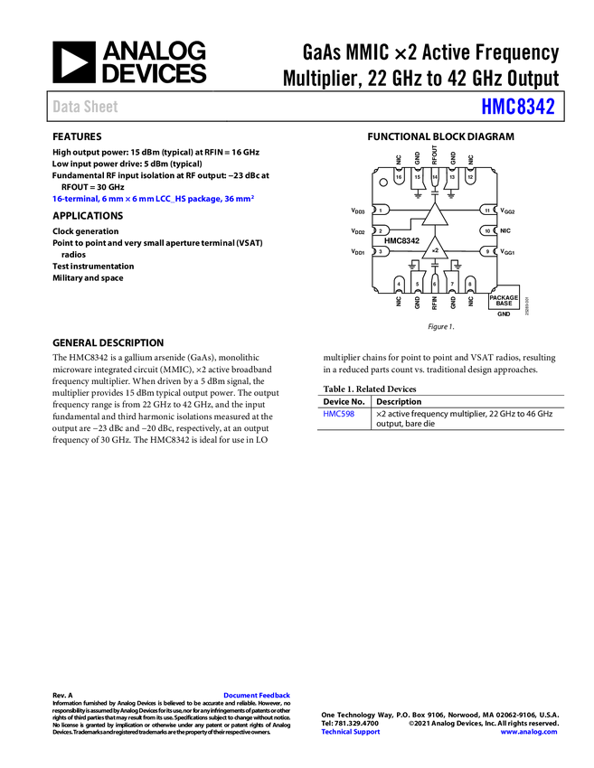 GaAs MMIC ×2 Active Frequency Multiplier, 22 GHz to 42 GHz Output