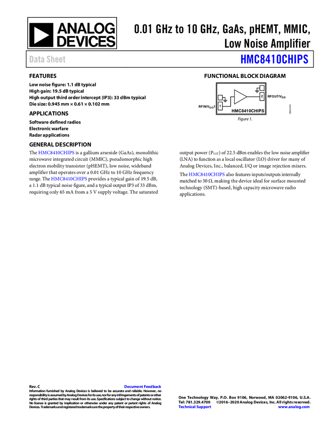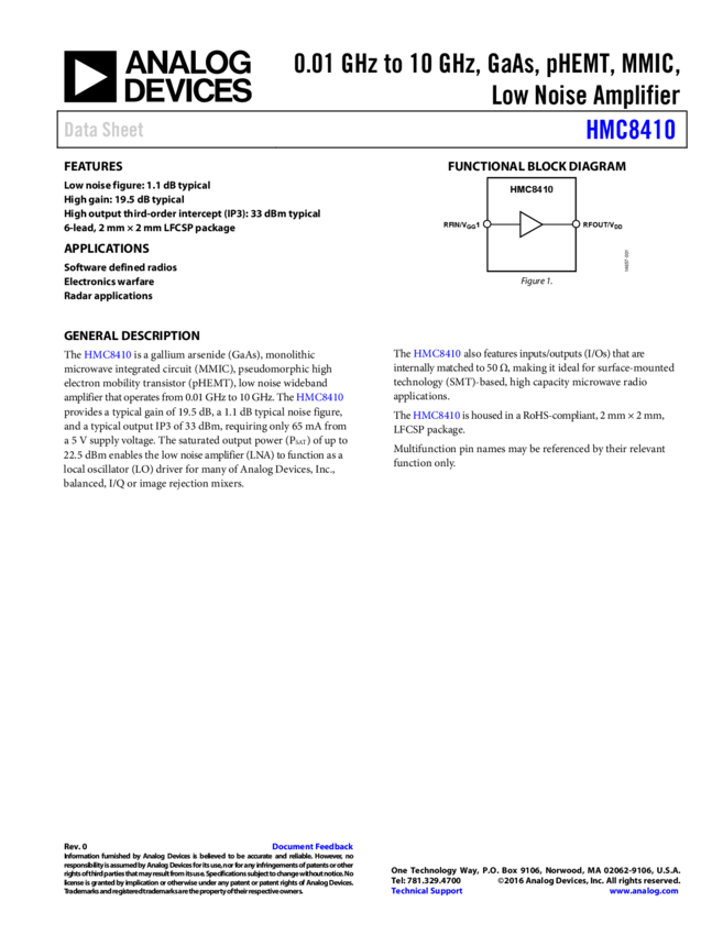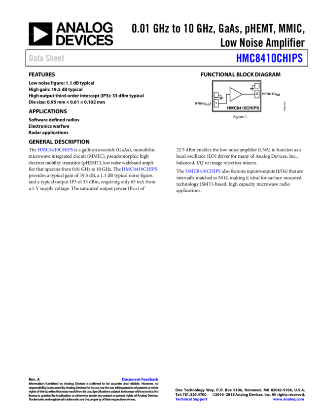 0.01 GHz to 10 GHz, GaAs, pHEMT, MMIC, Low Noise Amplifier