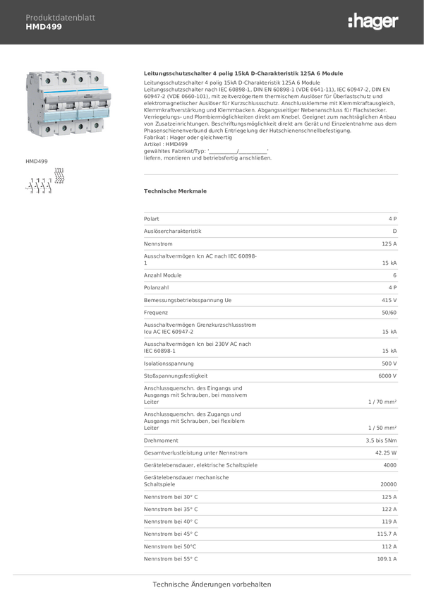 Hager HMD199 Wyłącznik automatyczny 1 styk 125 A 415 V