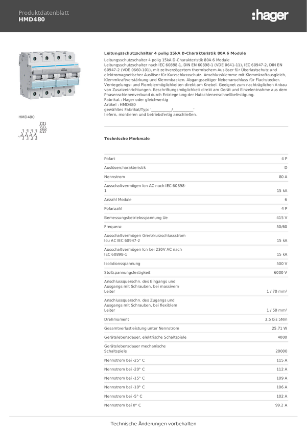 Wyłącznik automatyczny Hager HMD480, 4 styki, 415 V, 80 A