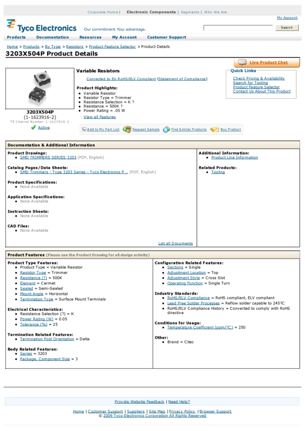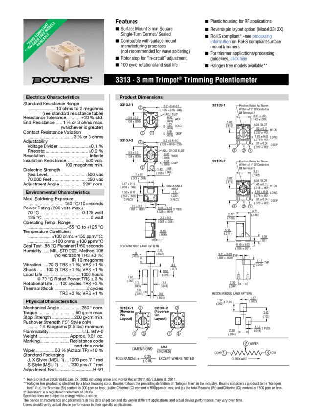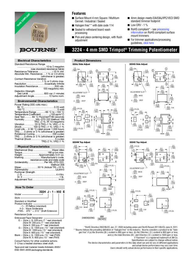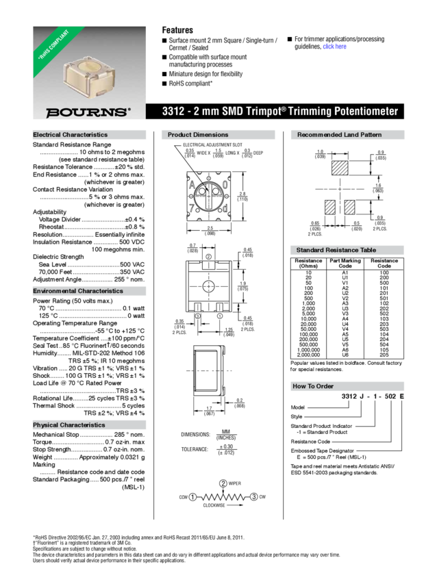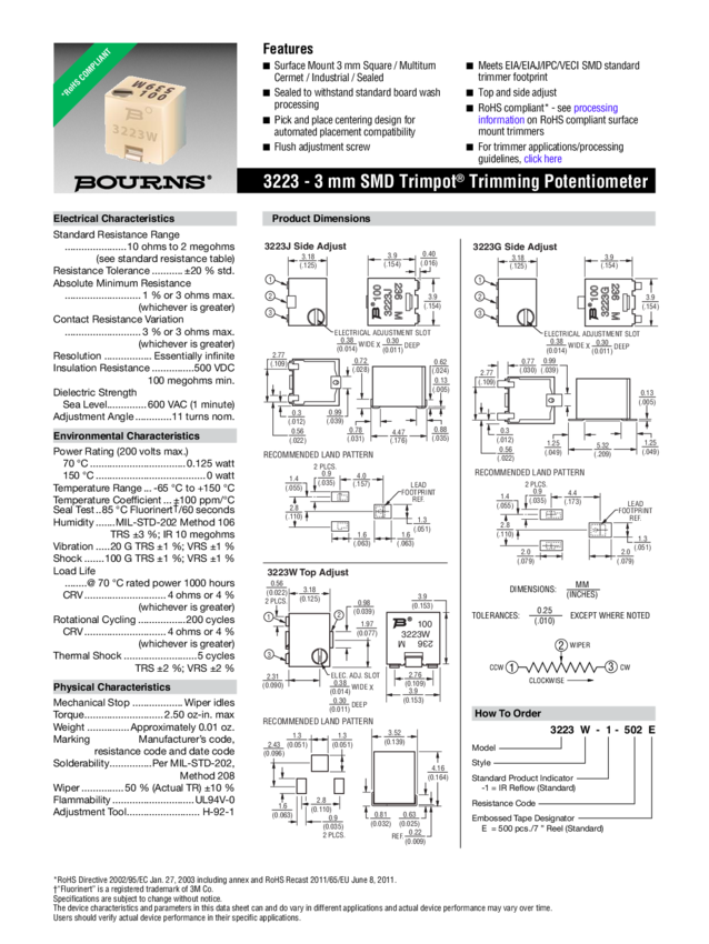 Res Cermet Trimmer 500K Ohm 25% 1/20W 1Turn 1.9mm J-Hook SMD T/R