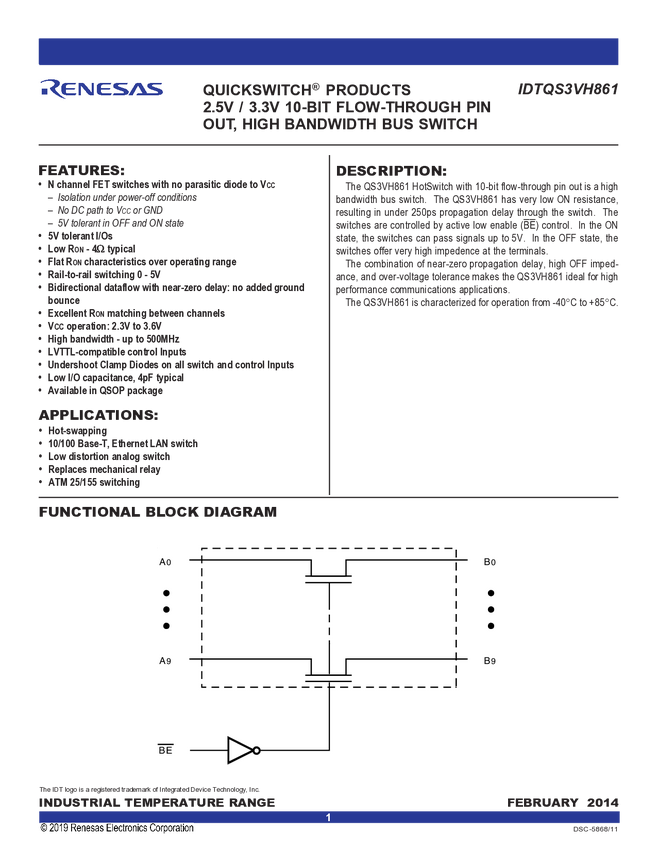 2.5V/3.3V 10-Bit Flow-Through Pin Out, High Bandwidth Switch for Hot Swap Applications (HotSwitch)