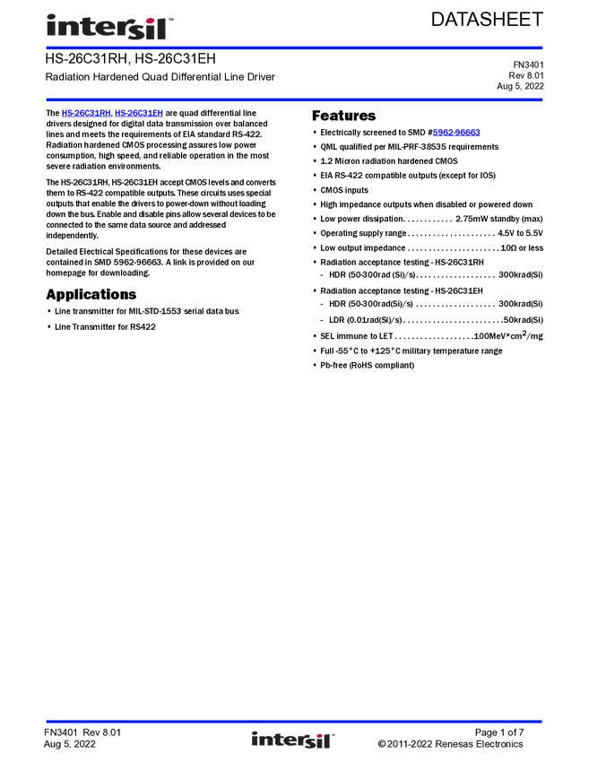 Quad, 5.0V Differential Line Driver, CMOS Enable Class T Datasheet