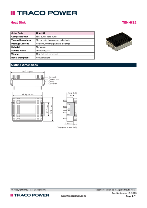 TracoPower TEN-HS2 TEN-HS2 Radiator (D x S x W) 40.6 x 50.8 x 7 mm