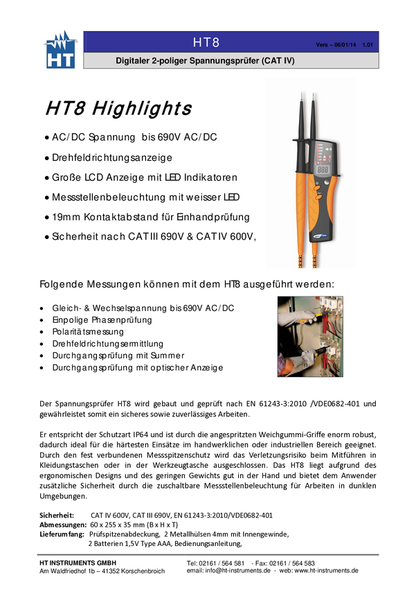Dwubiegunowy tester napięcia HT Instruments HT8 CAT III 690 V, CAT IV 600 V Kalibracja (DAkkS)