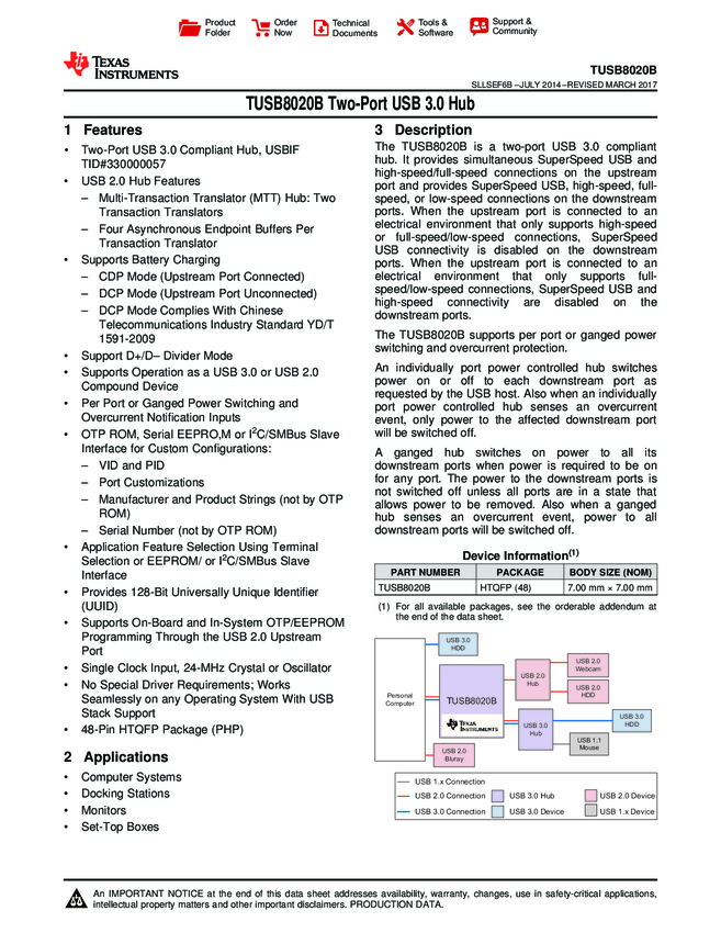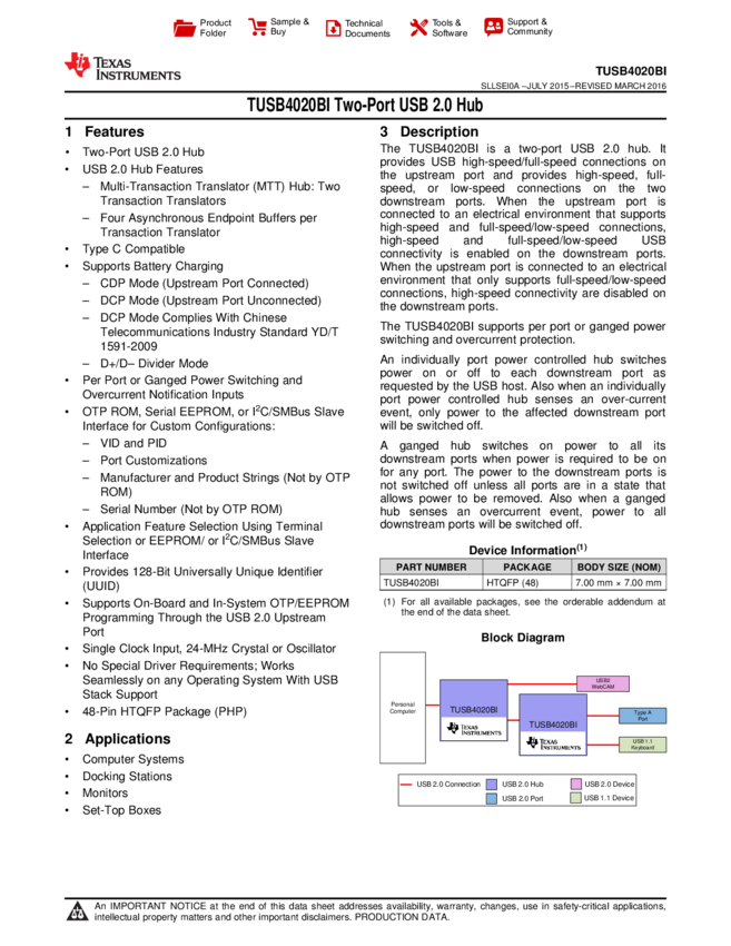 Two-Port USB 2.0 Hub 48-Pin HTQFP T/R