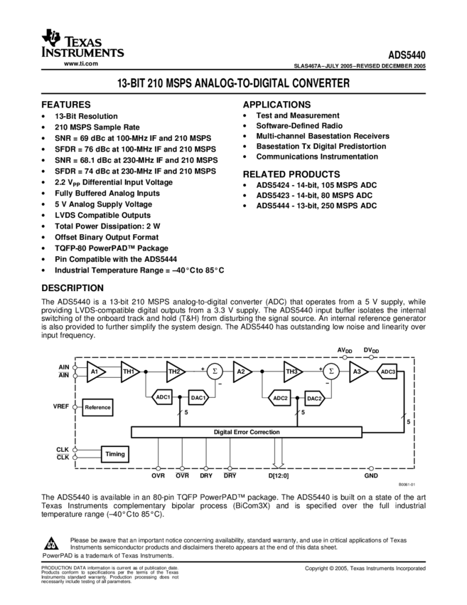 ADC Single Pipelined 210Msps 13-bit LVDS 80-Pin HTQFP EP T/R