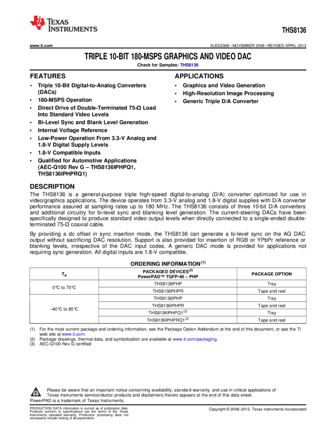DAC 3-CH Current Steering 10-bit 48-Pin HTQFP EP T/R