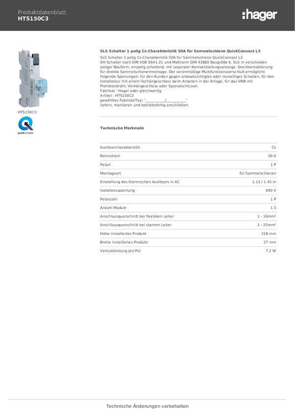 Wyłącznik główny bezpieczeństwa Hager HTS150C1, 1 styk, 400 V, 50 A