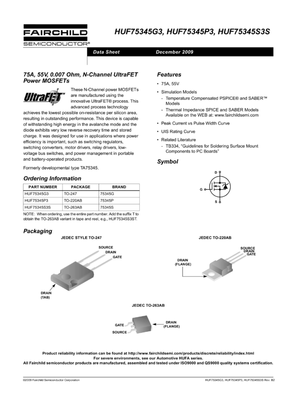75A, 55V, 0.007 Ohm, N-Channel UltraFET Power MOSFET