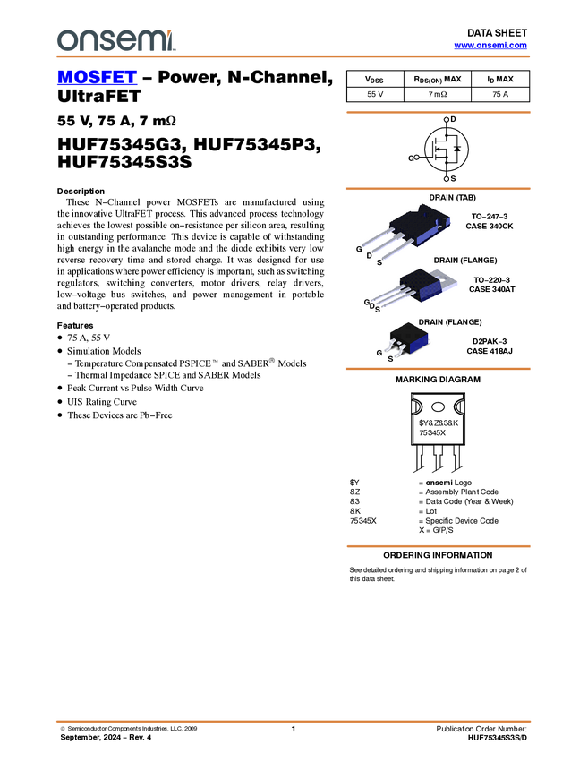 N-Channel UltraFET Power MOSFET 55V, 75A, 7mΩ