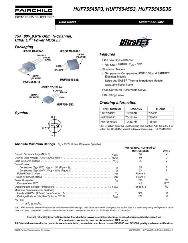 N-Channel UltraFET Power MOSFET 80V, 75A, 10mΩ