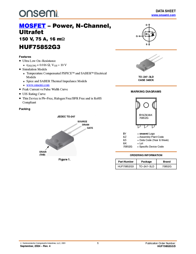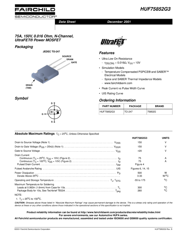 150V, 75A, 13mΩ, TO-247N-Channel UltraFET®