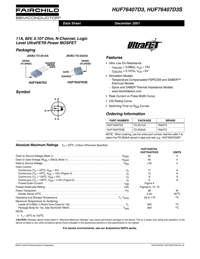 N-Channel Logic Level UltraFET Power MOSFET 60V, 11A, 107mΩ