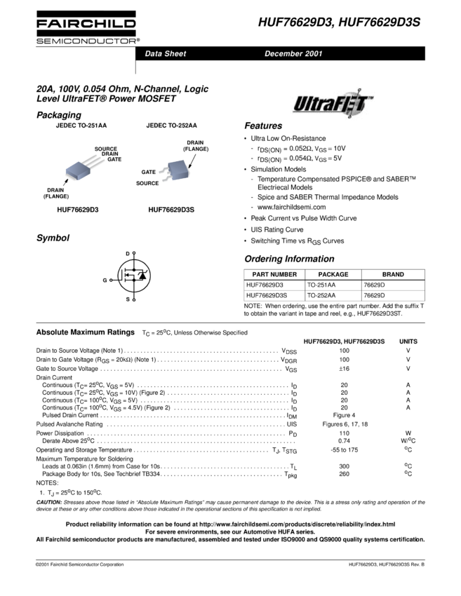 N-Channel Logic Level UltraFET Power MOSFET 100V, 20A, 54mΩ